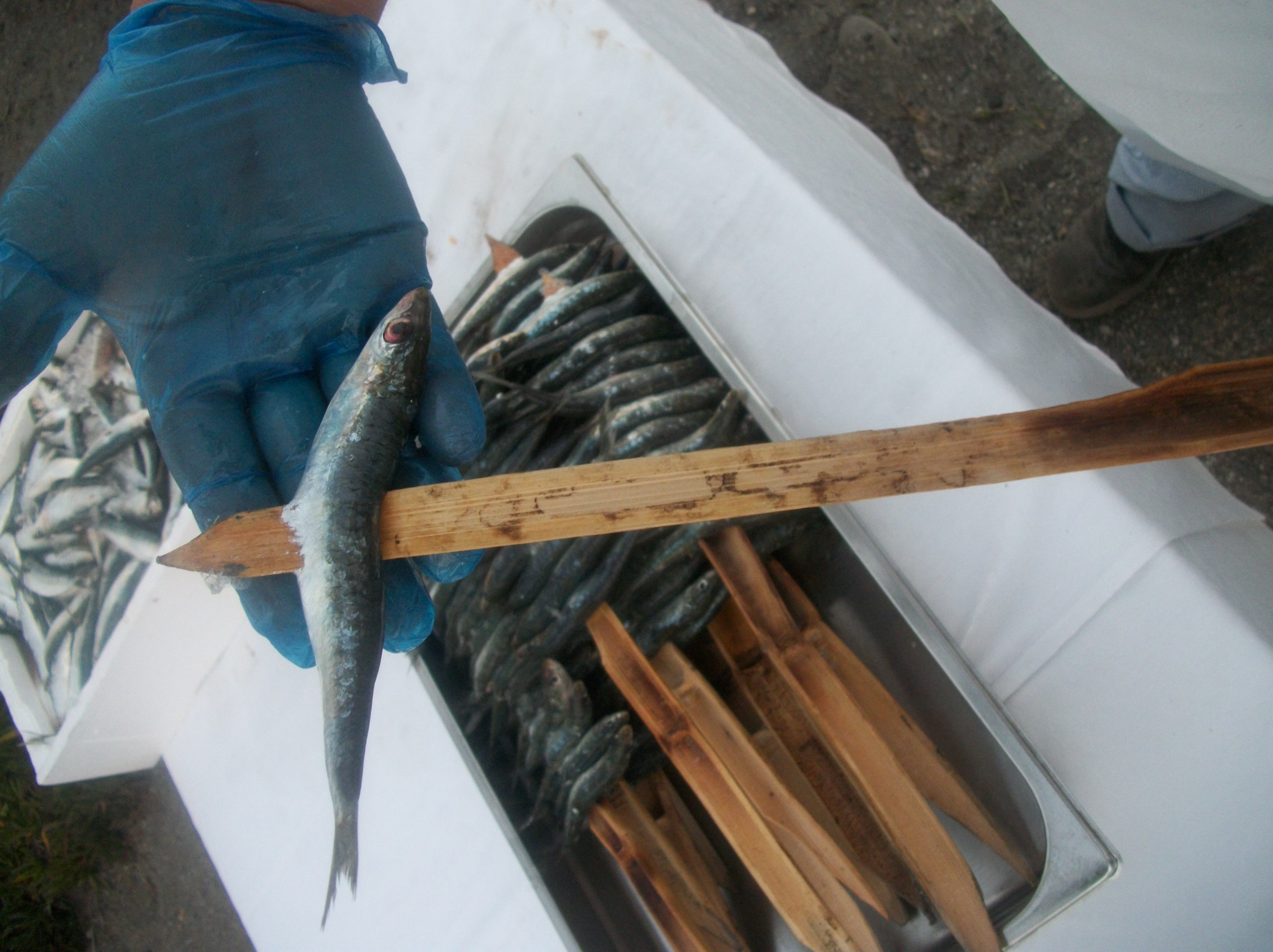 Conseguir o fabricar la caña de espetar( tambien la venden de acero inoxidable), colocar la sardina con la cabeza mirando a la palma de tu mano. Pinchar por debajo de la aleta dorsal como en la foto